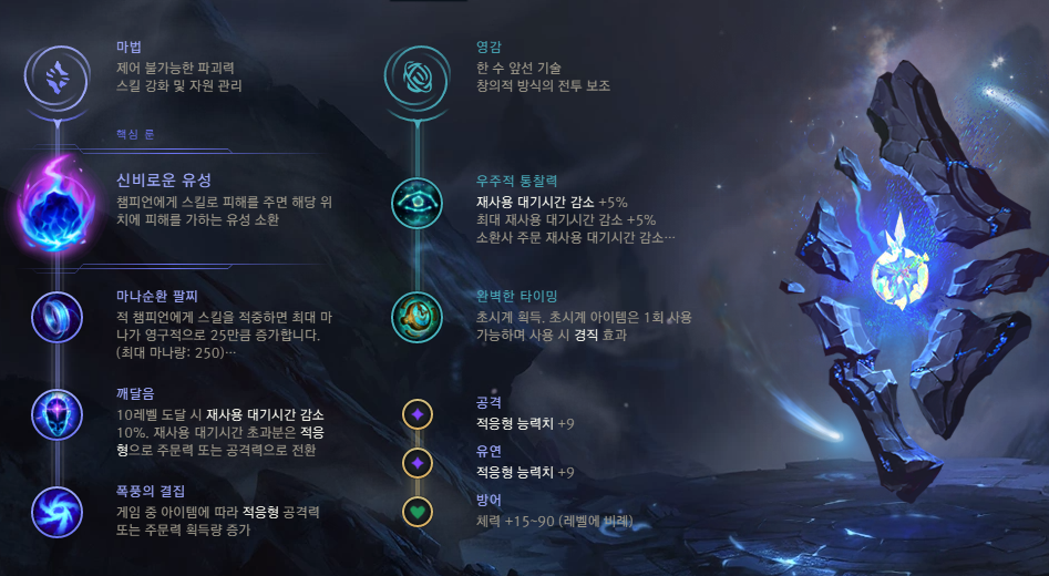 그럼 본격적으로 롤 시즌9 말자하 룬 공략부터 소개를 해드리도록 하겠습니다. 먼저 핵심특성은 신비로운 유성을 사용해 주시는걸 추천합니다. Q 스킬을 이용해 침묵을 걸기는 하지만, 상대방을 둔화시키는 스킬은 없기 때문에 일반적으로 콩콩이 소환을 많이 사용하는 것을 볼 수 있는데요. 전투를 하다 보면 공허충도 신경을 써야 하고, CS도 챙겨야 하기 때문에 유성을 모두 피할 수는 없는 편입니다. 특히 라인전이 끝나고 본격적인 전투가 시작이 되면 더 그런데요.