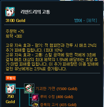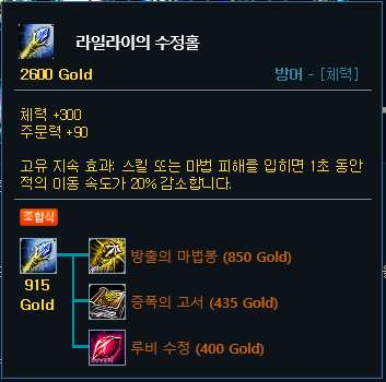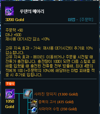 저도 역시 1코어는 루덴의 메아리를 올려주시는걸 추천합니다. 첫 귀환에서는 사라진 양피지를 올려주시면 가장 좋고, 만약 골드가 부족하다면 그 하위템을 올려주시면 됩니다. 2코어는 가격도 저렴하고 주문력과 체력까지 올려주면서 상대의 이동속도까지 20%나 감소시켜주는 라일라이를 올려줍니다. 3코어로는 리안드리를 올려주시고, 4코어로 존야까지 올려주시면 됩니다.