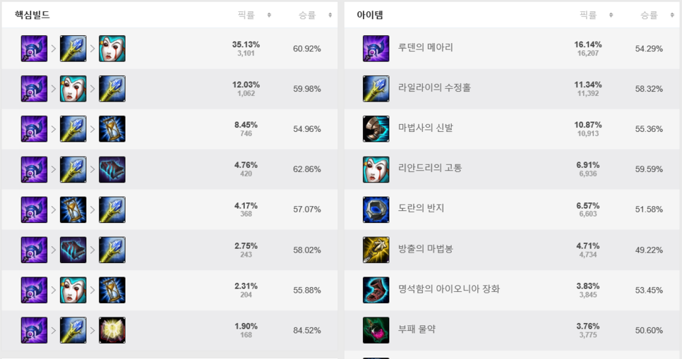 마지막 5코어는 상황에 따라서 유동적으로 올려주시면 되는데, 상대팀에 탱커가 많고 마법 방어력을 올려주는 아이템을 많이 사용했다면 공허의 지팡이, 암살자 챔피언이 있다면 해당 챔피언에 맞는 방템을 올려주셔도 좋습니다. 딜을 극대화해주려면 라바돈, 또는 마관과 주문력까지 챙길 수 있는 모렐로도 괜찮은 편입니다.