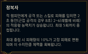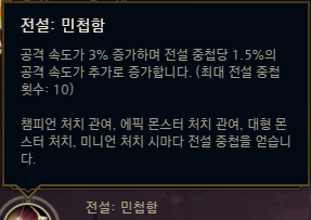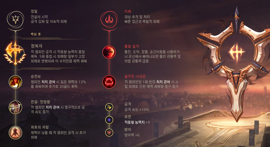 정복자 이하로는 킬과 어시스트를 기록한 경우 순간적으로 잃은 체력의 12%를 회복해주기 때문에 전투 지속력을 극대화해줄 수 있는 승전보를 사용해주시면 되고, 전설: 민첩함을 사용해서 공속을 올려주시면 됩니다. 만약 상대팀에 CC기가 많은 편이라면 전설: 민첩함 대신, 전설: 강인함을 사용해서 강인함을 챙겨주셔도 좋습니다.