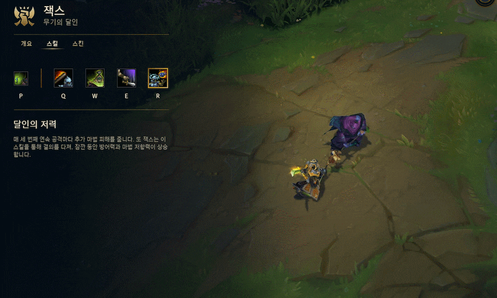 Q로 진입해 평W평과 E를 사용하면 빠르게 5회 중첩을 쌓을 수 있는데, 피해량의 10%가 고정 피해로 변환되기 때문에 탱커도 녹일 수 있고, 이 수치만큼 체력을 회복해서 전투 지속력도 올려주는 특성입니다. 잭스와 정말 잘 어울리는 것 같지 않나요!?ㅎㅎ