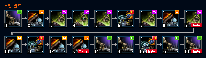2렙이 되면 Q를 올려서 기동력을 올려주시는게 좋은데요. 만약 상대 챔피언이 근접 챔피언이고, 만만하다 싶으면 W를 올려서 더 적극적으로 딜교를 해주시면 되겠습니다. 3렙에는 Q와 W중 올리지 않은 스킬을 마저 올려주시고, W - Q - E 순으로 마스터를 해주시기 바랍니다.