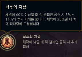 마지막으로 최후의 저항을 사용해서 1:1 상황에서 좋은 모습을 보여줄 수 있도록 해주시기 바랍니다. 일반적으로 승전보와 더불어 최후의 일격을 많이 사용하실 텐데요. 스플릿과 1:1 전투를 많이 하는 잭스의 특성상 최후의 저항이 더 좋은 효율을 보여주는 편입니다.
