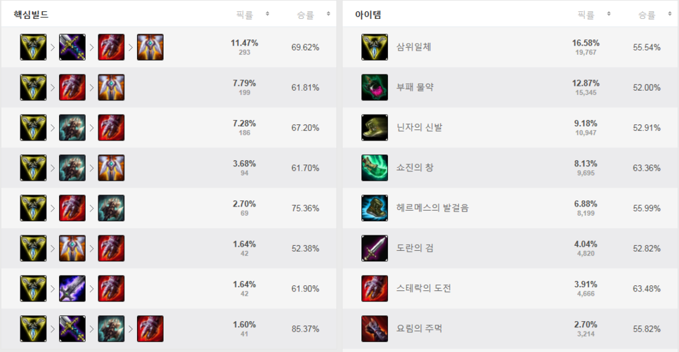 플레이 횟수는 293,342회로 인기도 매우 높은 것을 볼 수 있습니다. 컨트롤 난이도가 높은 편이 아니면서 상황 판단력 만으로도 매우 높은 캐리력을 보여주기 때문이 아닐까 하는데요. 최근 승률이 점점 상승하면서 인기도 역시 함께 상승을 하는 모습을 보여주고 있네요.