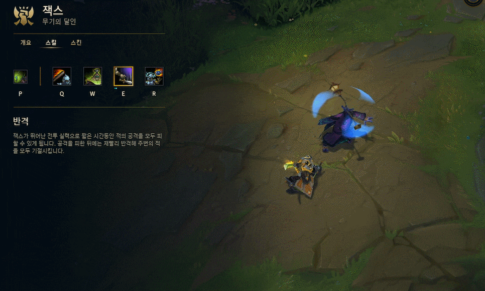 W(무기 강화) 스킬은 궁극기의 패시브 효과인 세번째 공격 추가 피해(쿵쿵따)효과와 더불어 잭스의 딜을 책임지는 스킬로, 마스터를 한 경우에 3초라는 매우 짧은 쿨타임을 보여줘 평W평 역시 잘 사용을 해주셔야겠습니다. 라인전에서 교전을 할 때 팁을 약간 드리면 미니언을 2대 때리고 Q로 적에게 진입해 평W평으로 딜을 넣은 뒤, E(반격)을 사용해 상대 챔피언을 기절시키면서 나오면 안정적으로 딜교에서 이익을 보실 수 있겠습니다.