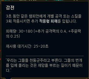 저도 역시 핵심 특성으로 감전을 사용하는 것을 추천하는데요. 감전은 3초동안 같은 챔피언에게 평타와 스킬을 3회 적중시키면 30에서 180에 추가 공격력의 40%를 더해 피해를 입히기 때문에. Q가 적중된 이후 적에게 돌진해 빠르게 딜을 넣을 수 있는 리신과 잘 어울리기 때문입니다. 초반 교전에서도 좋은 모습을 보여줄 수 있고, 공템을 2개정도 초반에 올리기 때문에 후반에도 딜러를 상대로는 데미지가 꽤 들어가는 편입니다. 재사용 대기시간도 최소 20초로 짧은 편이라, 한타가 오래 지속되면 2번도 터지는 경우가 많고요..