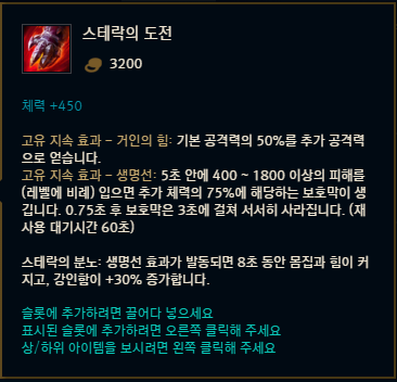 시작은 마체테와 물약을 구매해주면 되고, 1코어로 정글템을 용사까지 올려주시면 됩니다. 2코어로는 칠흑의 양날 도끼를 사용해주시면 되는데, 3코어는 무난한 경우에는 스테락을 사용해주시고 상대 AP 딜러가 너무 아프다면 2코어 이전에 주문 포식자를 올리고 멜모셔스까지 완성을 해주시면 됩니다.