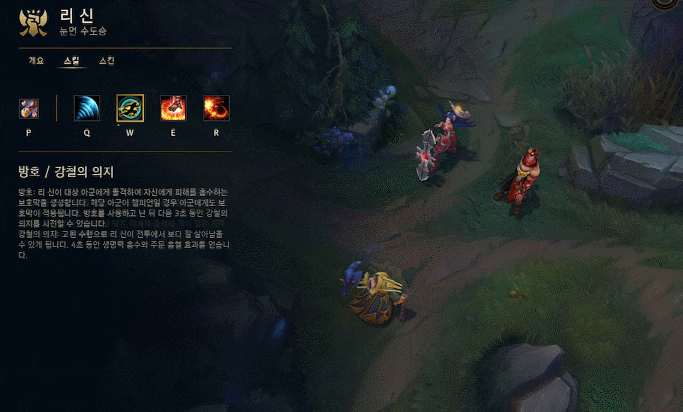다음으로 롤 시즌9 리신 스킬빌드 공략을 알아보겠습니다. 먼저 1렙에는 W 스킬을 사용해서 정글링을 시작해 주시는게 좋은데요. 초반에는 대부분 바텀 라인에서 리쉬를 해주기 때문에 아군에게 방호를 타고 들어가 보호막을 소모하고, 생명력 흡수 효과도 볼 수 있어 몹을 잡으면서 체력 관리를 수월하게 하도록 도와줍니다.