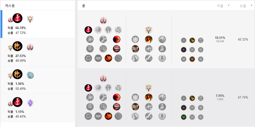 현재 승률 통계를 보면, 꽤 낮은 모습을 보여주고 있습니다. 48.38%로 전체 챔피언중 126위에 랭크가 되며 하위권에 위치하고 있는데요. 플레이 횟수는 710,482회로 인기는 매우 높은 모습입니다. 에가 위에서 말씀드린 Q 공명의 일격으로 무리하게 진입해 궁극기로 화려한 플레이만 노리지 않는다면 승률은 더 올라갈 것 같네요..