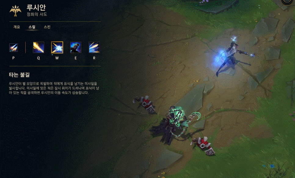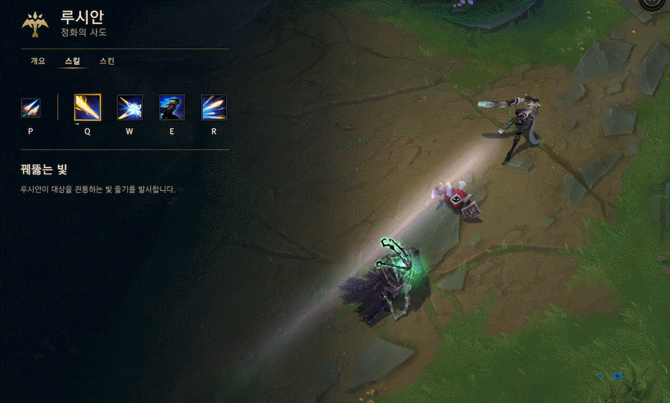 루시안은 패시브가 스킬을 사용하면 두번 나가기 때문에 딜을 넣기가 좋고, 순간딜이 좋은 편입니다. 라인 클리어도 빠른 편이며 Q 스킬은 미니언을 통과해서 딜을 넣을 수 있어 라인전도 강하게 압박을 할 수 있고, 이동기도 있어서 생존력도 좋은 편입니다. 특히 W스킬을 잘 사용하면 순간적으로 이동속도까지 상승이 되기 때문에 한타에서 좋은 포지션을 차지할 수 있기도 한 챔피언입니다.