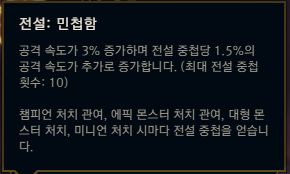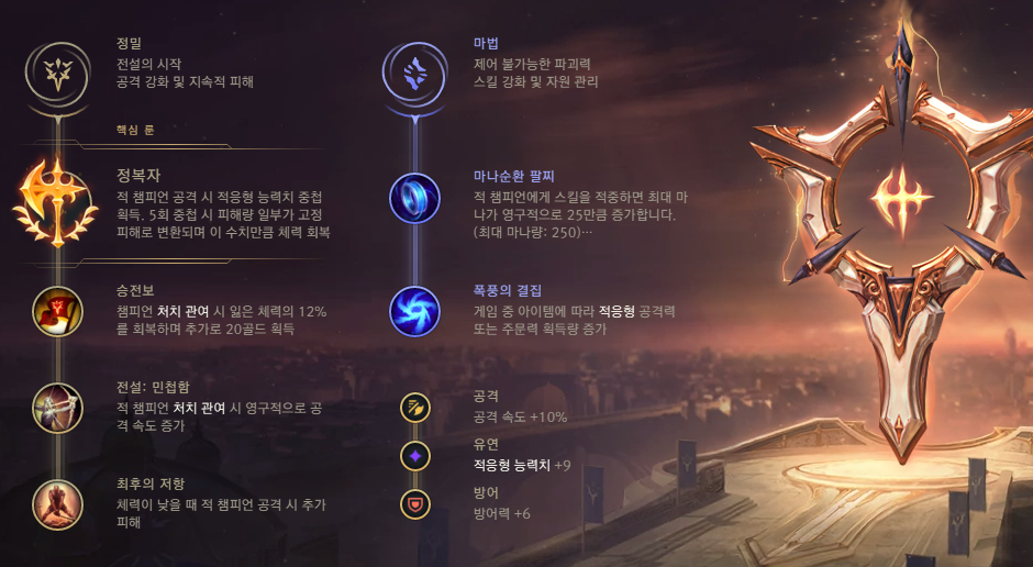 집중 공격은 3회 기본 공격을 가하면 레벨에 따라서 40~180의 적응형 추가 피해를 입히고, 약점을 노출시키기 때문에 나쁜 특성은 아니지만 최근 버프로 인해 많이 사용되는 정복자가 딜은 물론 생존력까지 더 올려줄 수 있어 저는 정복자를 사용해주시는걸 추천합니다. 특히 보조 룬으로 영감의 마법의 신발이 사용되는데, 마법의 신발이 12분으로 너프가 되면서 12분까지 신발을 구매할 수 없기 때문에 현재는 다른 보조룬과 특성을 사용해주시는게 더 좋은데요.