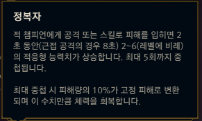 먼저 정복자는 공격 또는 스킬 피해를 입히면 5회까지 중첩이 쌓이고 중첩마다 2~6의 적응형 능력치가 상승합니다. 최대 중첩이 되면 피해량의 10%가 고정 피해로 변환이 되며, 해당 수치만큼 체력이 회복되기 때문에 패시브로 빠르게 중첩을 쌓을 수 있는 루시안과 매우 시너지가 좋은 편입니다. 10% 고정 피해로 나를 물러오는 딜탱이나 탱커를 녹이기도 좋으며 체력 회복으로 생존력까지 올려주기 때문에 지속딜이 좋은 루시안의 특성상 집중 공격보다 더 좋은 모습을 보여줄 수 있습니다.