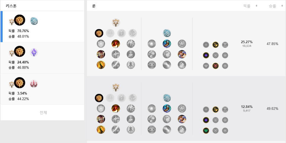 리그오브레전드의 챔피언들은 메타의 변화나 작은 밸런스 패치에도 티어가 변동이 되기도 합니다. 이렇게 관리를 하고, 안될 것 같은 챔피언은 리메이크를 통해서 살려주기도 하기 때문에 꾸준하게 인기를 이어갈 수 있는 것 같은데요. 가끔은 충분히 좋은 모습을 보여줄 수 있음에도 룬과 템트리를 제대로 사용을 하지 못해서 낮은 승률을 보여주는 경우도 있는 것 같습니다.