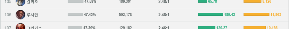 이렇게 전체적으로 좋은 스킬셋을 보유하고 있는데, 요즘 승률은 너무 낮은 모습을 보여주고 있는데요. 47.43%의 승률로 전체 챔피언중 136위에 랭크가 되며 거의 가장 낮은 승률을 보여주고 있습니다. 하지만 플레이 횟수는 502,178회로 매우 인기 있는 모습을 보여주고 있는데요. 오늘은 이렇게 낮은 승률을 어떻게 하면 올릴 수 있을지를 알아보겠습니다.