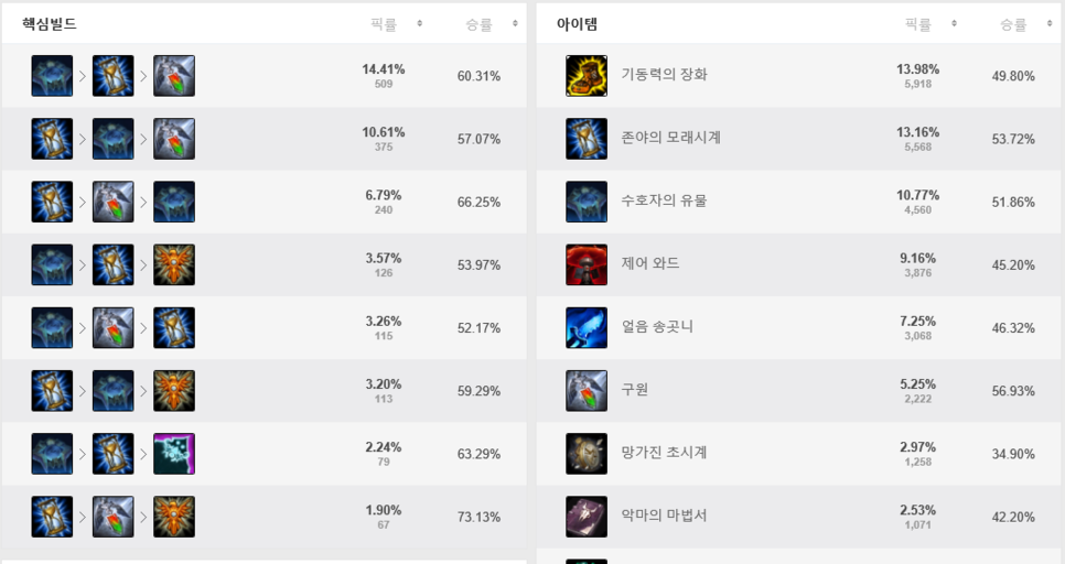 플레이 횟수는 446,492회로 매우 인기 있는 모습을 보여주고 있는데요. 미드 라인에서도 사용이 되고 있지만 약 85%가 서폿으로 사용을 하고 있다는걸 감안하면 현재 1티어 챔피언으로 봐도 무방해 보입니다.